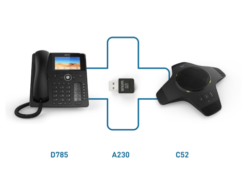 Combinando el Snom A230 - DECT Dongle con el Snom C52-SP, Snom ofrece una forma económica y flexible de transformar cualquier teléfono de sobremesa Snom que disponga de al menos un puerto USB en un dispositivo inteligente para conferencias.